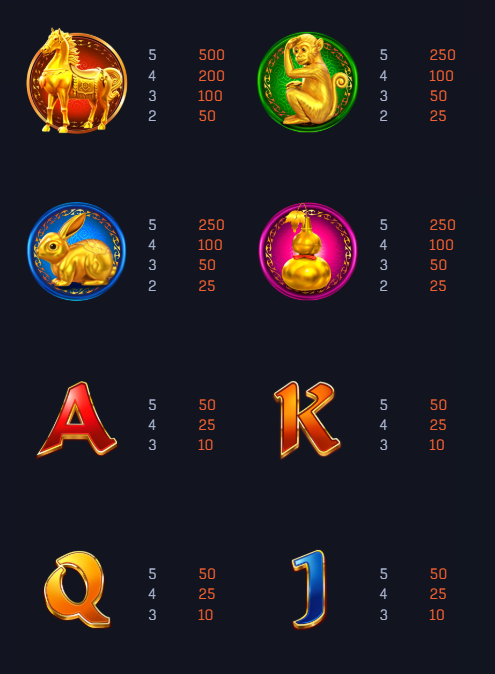 在賠付表中,馬和猴子這兩個符號尤為吸引我。馬象徵著高額回報,當玩家轉出五個馬符號時,能獲得500倍的賠付,我覺得這是整個遊戲中最具吸引力的部分之一。而猴子則提供次高的賠付,同樣滿足了玩家追求大額獎金的需求。我認為這樣的設計給了玩家一個明確的目標,讓遊戲過程更加刺激。