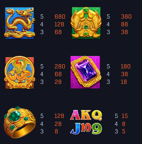 我認為《鑽石永恆》的賠付表設計得非常合理且具吸引力。遊戲以金龍與金幣為核心高額符號,吸引玩家追求大獎;以鳳凰與寶石為中堅符號,提供穩定回報;最後再以戒指與字母符號填補遊戲的節奏與基礎獎勵,讓整體玩法更加豐富與多元。