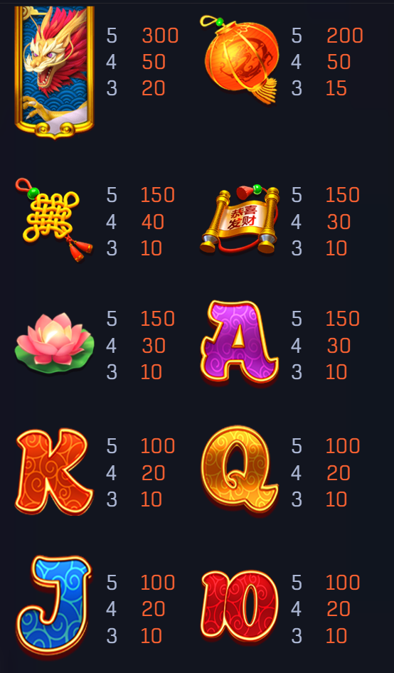 《龍之財富》的賠付表設計非常人性化且層次分明,從龍和燈籠這類高額符號到吉祥結和蓮花這類中低額符號,充分考慮了玩家的多樣化需求。特別是高額符號的出現頻率與回報設計,既能吸引追求大獎的玩家,又能讓每次旋轉都充滿驚喜。