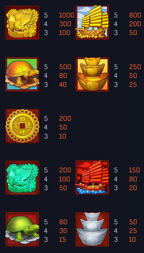金色祥鳥作為最高賠付符號,五連線可帶來1000倍的獎金。我認為,這不僅象徵著富貴與繁榮,還讓玩家在追逐大獎時感受到極大的期待感。而緊隨其後的金船符號,五連線則提供800倍的豐厚回報,這樣的設計讓玩家有更多的目標可以追逐,遊戲的趣味性倍增。