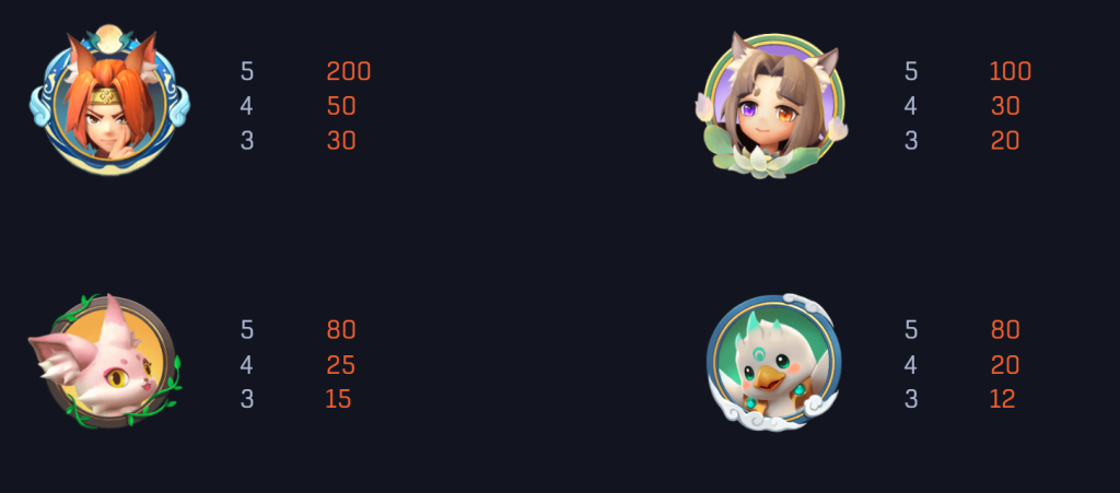 《尋妖錄》的賠付設計充分考慮了遊戲的平衡性與趣味性。高價值符號的出現雖然較少,但其豐厚的回報足以激勵玩家繼續挑戰。而中低價值符號則提供了穩定的中獎機率,保證了玩家遊戲體驗的流暢性和持續性。