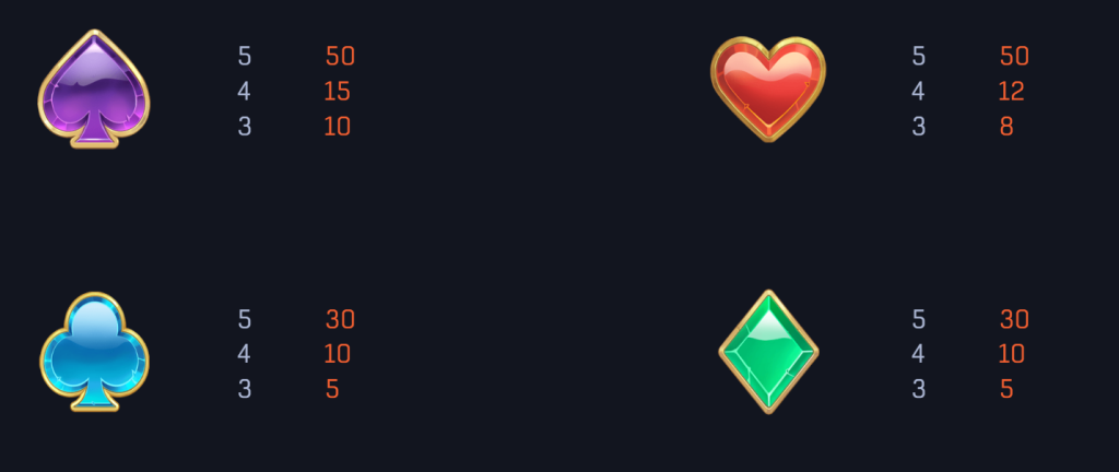 除了主要角色,遊戲還加入了色彩繽紛的寶石符號和撲克牌花色符號,這些符號的賠付相對較低,但在旋轉過程中出現頻率較高。例如,紫色梅花和紅色愛心符號的最高賠付為50倍,而藍色方塊和綠色方塊則提供30倍的賠付。我認為這些符號的設計為玩家提供了穩定的獲利基礎,適合喜歡耐玩和穩步累積獎金的玩家。