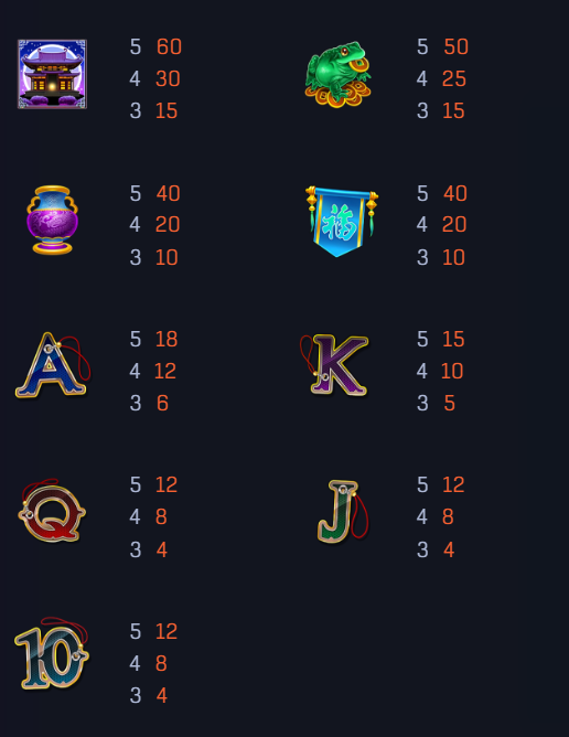 遊戲中最高價的符號是紫色燈籠和招財金蛙,這些符號的設計非常符合遊戲的主題,代表了吉祥與財富。當這些符號以五連線的形式出現時,分別可以獲得高達60倍和50倍的賠付,我認為這對於追求高額獎金的玩家來說無疑是最具吸引力的部分。這些符號的出現頻率雖然較低,但正是因為這樣,才讓每一次旋轉都充滿期待。