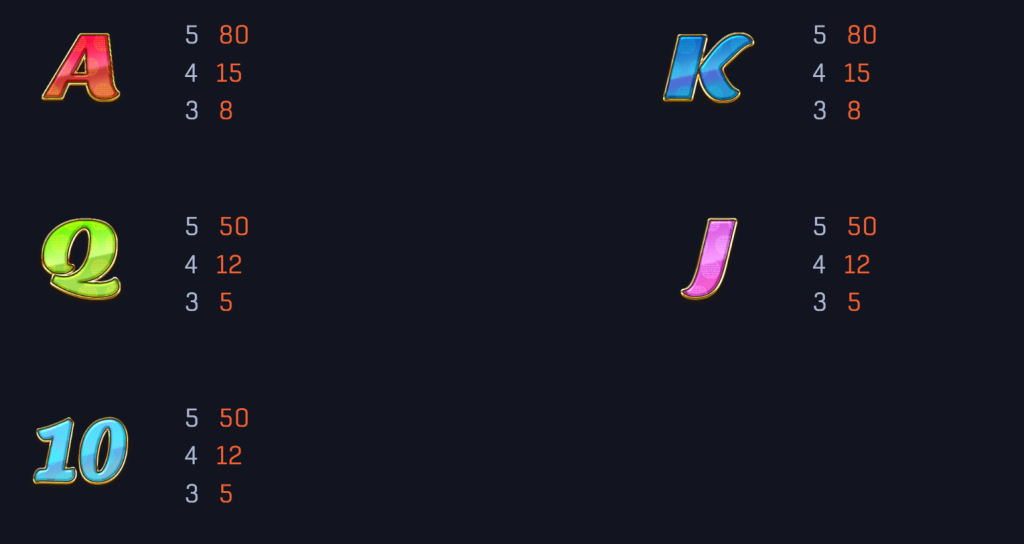 低賠付符號包括A、K、Q、J和10,這些符號的賠付範圍雖然相對較低,但在頻繁出現的情況下,仍然能夠為玩家帶來穩定的收益。我覺得這樣的設計有效平衡了遊戲的風險與回報,讓玩家在追求高額獎勵的同時,享受到穩定的娛樂體驗。