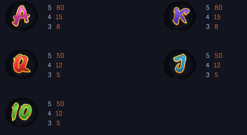 低賠付符號則以撲克牌字母和數字組成,包括A、K、Q、J、10等,五連線賠付範圍從50倍到80倍不等。這些符號雖然回報較低,但出現頻率較高,為玩家提供了穩定的小額收益。我認為,這種基礎符號的設計有效地平衡了遊戲的波動性,讓每一位玩家都能感受到回報的快感。