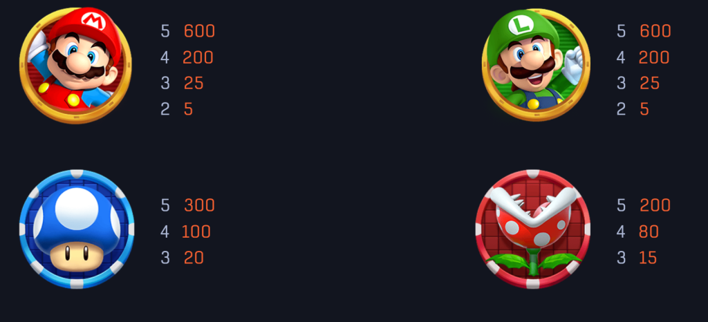 從賠付圖來看,瑪利歐與路易吉作為遊戲的高賠付符號,最高可提供600倍的獎勵,這無疑是玩家追求的目標之一。我覺得,這樣的設計不僅還原了經典角色的重要性,也為玩家帶來了豐厚的回報。其次,藍色蘑菇符號的最高賠付達到300倍,而吃人花符號則提供最高200倍的獎金,這些符號頻率適中,能為玩家提供穩定的驚喜。