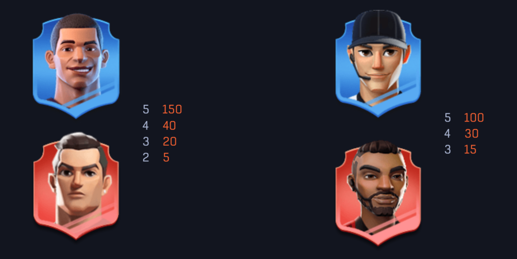 在賠付圖中還有一些其他的球員符號和足球裝備符號,它們的賠付金額較低,但仍能為玩家提供穩定的小額獎勳。例如,裁判符號和球鞋符號,當這些符號出現五次時,玩家將獲得100點的賠付。隨著符號數量的減少,這些賠付金額會依次降低至30點和15點。我覺得這樣的設計讓遊戲的獎勳更加豐富,並且能夠為玩家帶來更多的獲獎機會。