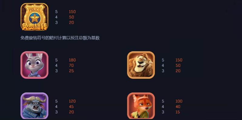 《瘋狂動物城》的賠付圖設計非常精緻,結合了動物角色、道具符號和豐富的賠付機制,給玩家帶來了非常有趣的遊戲體驗。高賠付符號如警察徽章和動物角色符號給予了玩家強烈的獲獎回報,而低賠付符號則能提供穩定的遊戲回報。