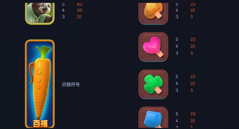 動物角色符號也是遊戲中的主要賠付符號。例如,「朱迪兔」符號在五次出現時,玩家將獲得180點的回報,這樣的高賠付使得這個角色成為玩家希望頻繁出現的符號。四次出現的回報為70點,三次則為25點。這樣的設計不僅豐富了遊戲的故事性,還增加了玩家的期望值,使每次旋轉都充滿了可能性。