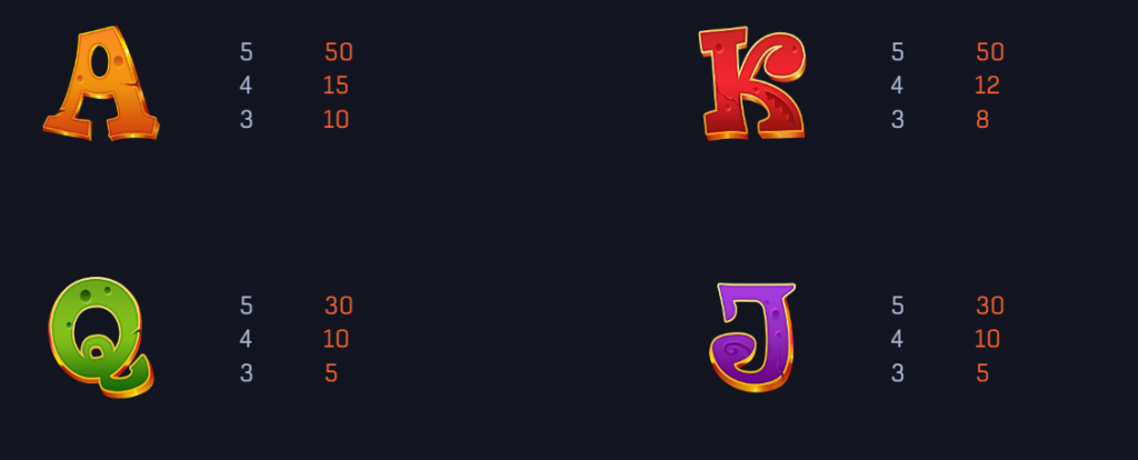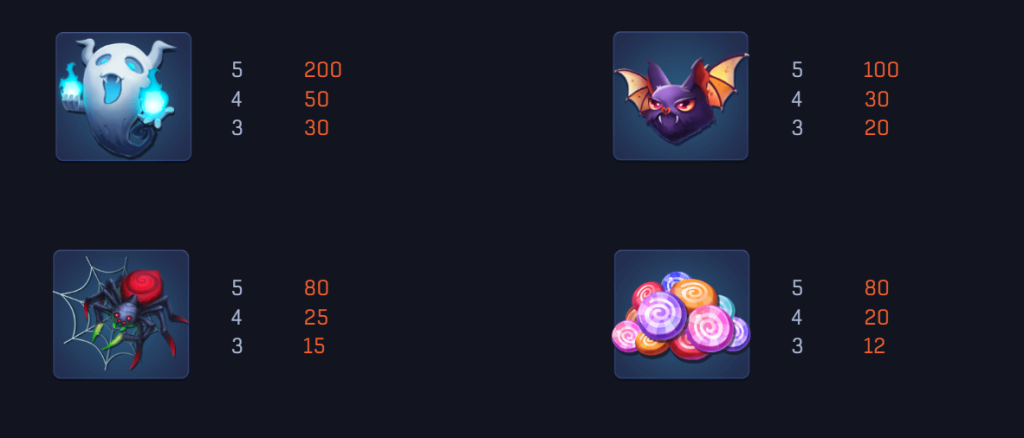在這款遊戲中,幽靈和蝙蝠是高賠付符號,其中幽靈提供最高的賠付,五個幽靈符號可帶來200倍的回報,我覺得這象徵了玩家在遊戲中的“大豐收”。蝙蝠作為次高賠付符號,五個可帶來100倍的回報,其次是蜘蛛和糖果符號,各自提供80倍的回報。我認為這種設計不僅有趣,而且讓玩家能在每次旋轉中充滿期待。