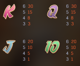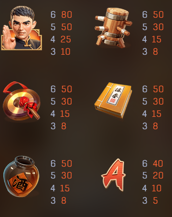 木人樁和傳統功夫道具(如金牌和武術書)則作為中價符號,賠付倍數介於50到30之間,這些元素我覺得既增添了遊戲的文化底蘊,又保持了遊戲整體的趣味性。而低價符號則是以牌面圖案呈現,從「A」到「10」不等,雖然獎金較低,但出現的頻率更高,為玩家提供穩定的收益來源。