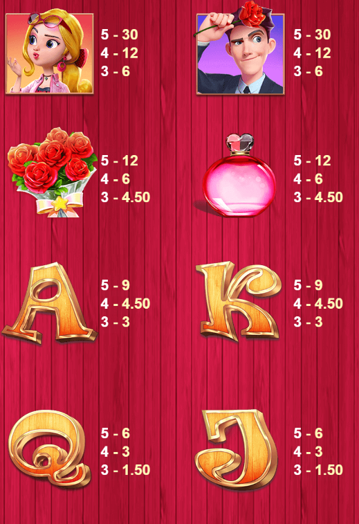 遊戲中,兩個主角圖案(女孩和男孩)是最高賠付的象徵,五個連線可達30倍的獎勵。我覺得這些圖案不僅象徵著約會的核心主題,也讓玩家在追求獎勵的同時,感受到遊戲的故事背景。每當這些高賠付圖案出現連線時,那種期待感與成就感讓遊戲更加吸引人。