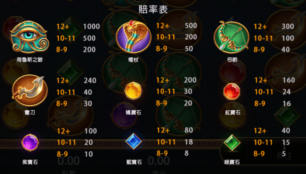 遊戲中「荷魯斯之眼」是最具價值的符號,當連線達到12個或以上時,可贏取高達1000倍的獎金。我覺得這個符號不僅在視覺上極具吸引力,也代表了古埃及文化中神秘與力量的象徵。其次是「權杖」和「弓箭」符號,分別提供500倍和300倍的回報,這些符號讓玩家每次旋轉都充滿期待。