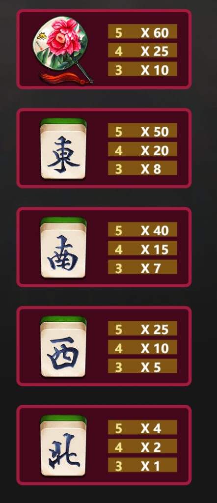 「紅花折扇」和「東南麻將牌」是遊戲中的中等賠付符號,其中「紅花折扇」提供60倍的最高獎金,而「東」字牌則有50倍的回報。我認為,這些符號不僅增添了遊戲的趣味性,也為玩家提供了穩定的中獎機會,特別是在連線較多的情況下,能幫助玩家快速累積積分。