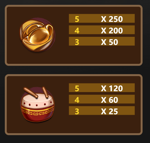 在遊戲中,「金元寶」是最高賠付的符號,當連線達到5個時,能帶來高達250倍的回報。我覺得這個符號是整個遊戲的亮點,象徵著財富與繁榮,非常契合「福氣神龍」的主題。其次是「鼓」,5個連線可以贏取120倍獎金,這為玩家提供了穩定的中獎機會,讓每次旋轉都充滿期待。