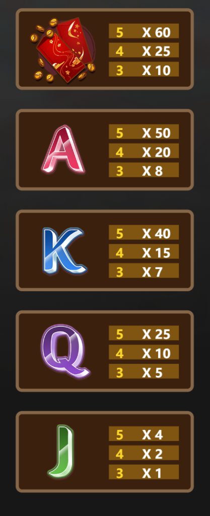 「紅包」作為中等賠付符號,5個連線可贏取60倍獎金。我認為這個符號不僅象徵著好運,還是玩家在追逐大獎時的重要資金累積來源。此外,「A」與「K」字母符號分別提供50倍與40倍的回報,它們的出現頻率適中,能幫助玩家在基礎旋轉中持續累積收益。