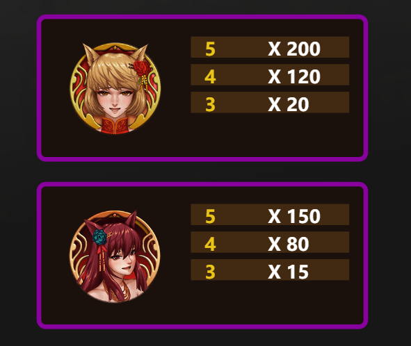 遊戲中最具價值的符號莫過於身著華麗服飾的狐妖角色。「金髮狐妖」是最高賠付的象徵,當5個符號連線時,可獲得200倍賠付,4個符號則為120倍,而3個符號也有20倍的回報。我認為這樣的設計對於追求大獎的玩家來說,是一個極具吸引力的目標。