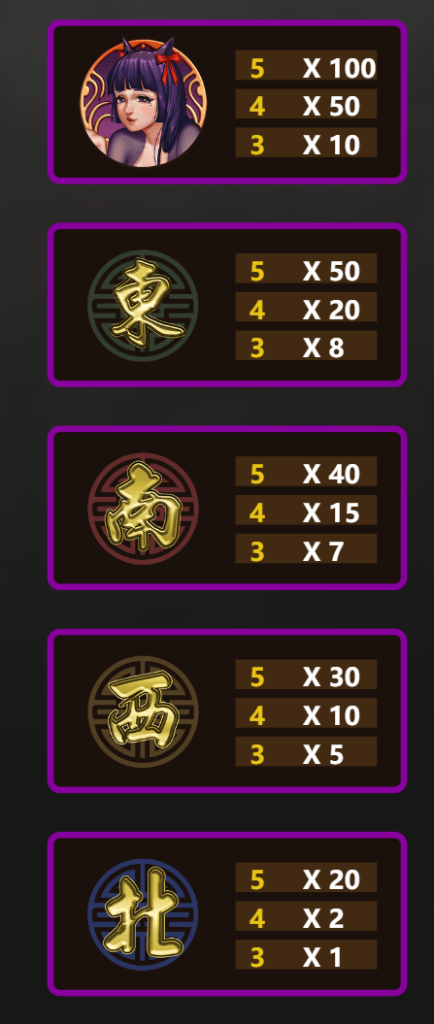 遊戲中的中低價值符號主要以東、西、南、北四個方位圖案呈現。「東」是最高的中價值符號,5個連線時可提供50倍回報,4個有20倍,3個則有8倍。「南」、「西」、「北」依次遞減,其中「北」的賠付為最低,5個符號連線僅有20倍,4個和3個符號分別為2倍與1倍。我認為,這些符號的存在雖然回報不高,但出現頻率較高,適合累積小額獎金,為玩家提供穩定的遊戲節奏。