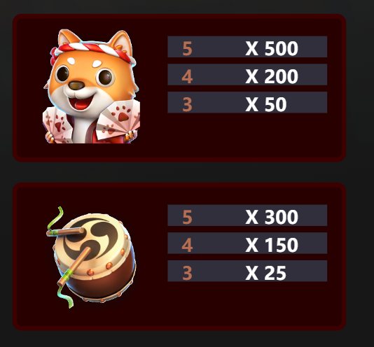 在《天狗祭》中,柴犬天狗是遊戲中的核心角色,也是最高賠付的符號之一。當玩家連線出現5個柴犬天狗符號時,將獲得高達500倍的回報,而4個符號則提供200倍,3個符號則有50倍。我認為,這樣的高額回報設計讓柴犬天狗成為玩家最期待出現的符號之一,尤其是在免費遊戲模式中。