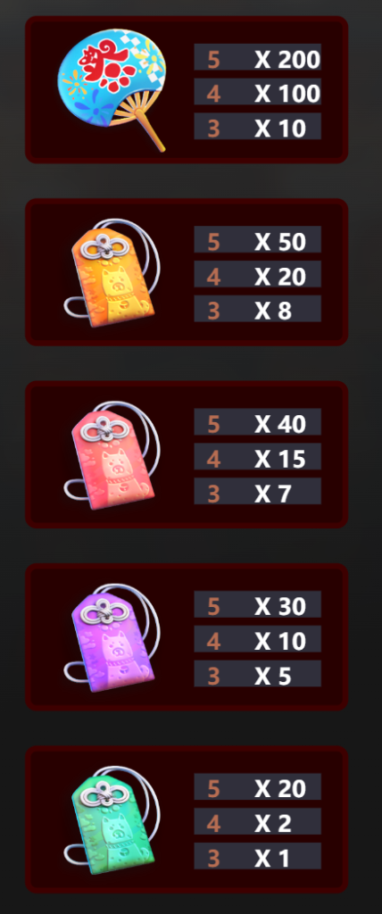 中價值符號包括「祭典紙扇」和多種不同顏色的護身符。「紙扇」符號的賠付相對較高,5個連線時可提供200倍的回報,4個符號有100倍,3個符號則有10倍。我認為,這個符號不僅美觀,還體現了祭典的傳統元素。