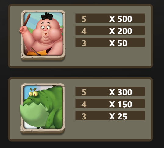 在遊戲中,最吸引玩家目光的無疑是胖胖原始人符號,這位胖乎乎的角色象徵著史前的力量與財富。他是遊戲中的最高賠付符號,當玩家成功連線5個原始人時,可獲得500倍賠付,4個則有200倍,而3個也能帶來50倍回報。我覺得,這個符號是每位玩家的夢想,因為它不僅帶來豐厚回報,還讓整個遊戲充滿了期待。