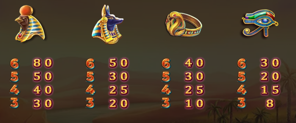 在高價值符號中,最具吸引力的是獅身鷹頭神霍魯斯,其最高賠付為80倍,當玩家收集到6個時,將能收穫巨額獎金。我認為這個符號不僅設計精美,還象徵著古埃及的守護神,為遊戲增添了神秘感。其次是阿努比斯(豺狼神),提供50倍的最高賠付,是另一個重要的贏獎符號,讓玩家在追逐大獎時充滿期待。