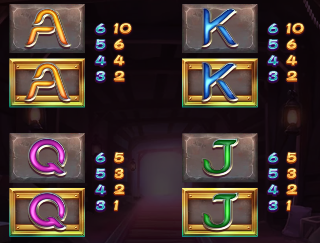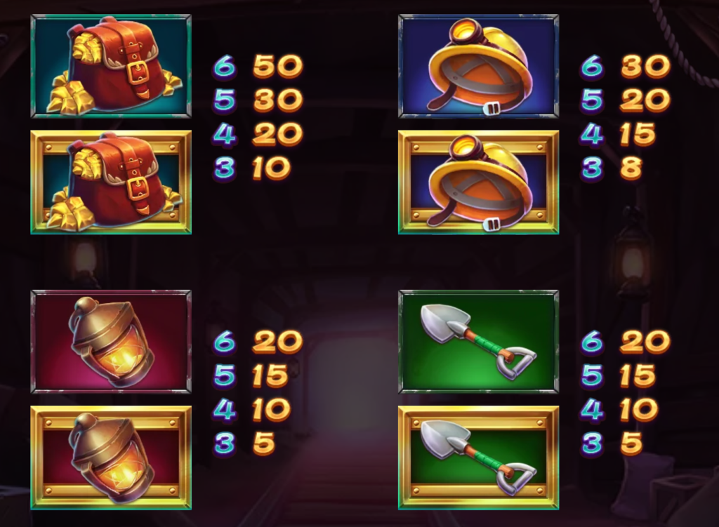 「提燈」與「鐵鍬」這兩個符號則代表了礦工的日常工具,分別提供20倍的最高賠付。我覺得這種設計非常貼近主題,讓人彷彿置身礦坑,手持提燈照亮黑暗,同時挖掘金礦。