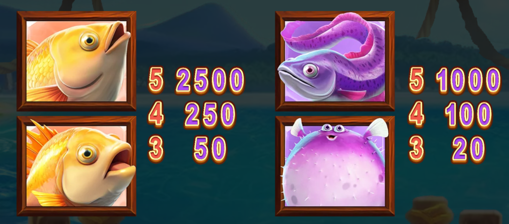 其中橙色金魚是最高賠付的符號,當連續5個橙色金魚出現時,可以獲得高達2500倍的獎金。這個設計讓人感受到捕獲稀有魚群的興奮。我覺得這部分充分體現了遊戲的主題,同時提供了極高的回報潛力,為玩家帶來更多期待。