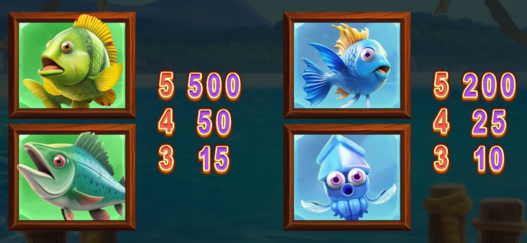 紫色鰻魚和紫色河豚則分別提供了1000倍和500倍的賠付,這些中等價值符號使遊戲在賠付層次上更加均衡,增加了玩家的中獎頻率。此外,藍色魷魚與其他低賠付符號,儘管回報不如高賠符號驚人,卻有效地維持了遊戲的動態節奏,讓每一次旋轉都充滿期待。
