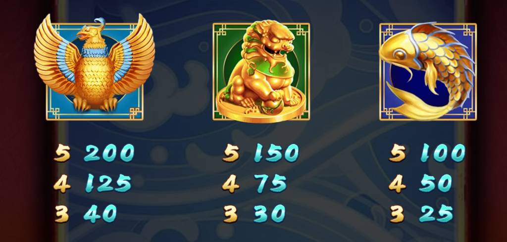 鳳凰作為最高價值的符號,5連線可帶來200倍的賠付。我覺得這樣的設計將鳳凰象徵的吉祥與高額回報完美結合。此外,貔貅和金魚分別以150倍和100倍的5連線賠付緊隨其後,這些傳統的財富象徵,為遊戲賠付注入了濃厚的東方文化元素。