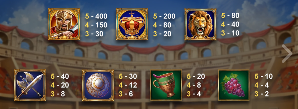 最高賠付的圖案是羅馬戰士,當玩家轉出5個相同圖案時,可獲得高達400倍的賠付。我覺得這個設計不僅符合羅馬戰士主題,更讓玩家感受到征服古羅馬戰場的榮耀。其次是皇冠,擁有150倍的次高賠付,同時象徵著權力與勝利。