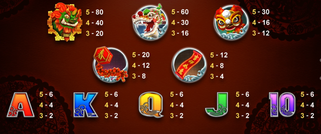 遊戲中的高價值符號包括綠色的舞獅頭(最高80倍)、傳統舞龍(最高60倍)以及紅色舞獅面具(最高30倍)。這些符號不僅延續了中國傳統文化的特色,還能為玩家帶來豐厚的回報。我認為這樣的設計,不僅讓玩家感受到節日的熱鬧氛圍,還能體會到財富湧入的喜悅。