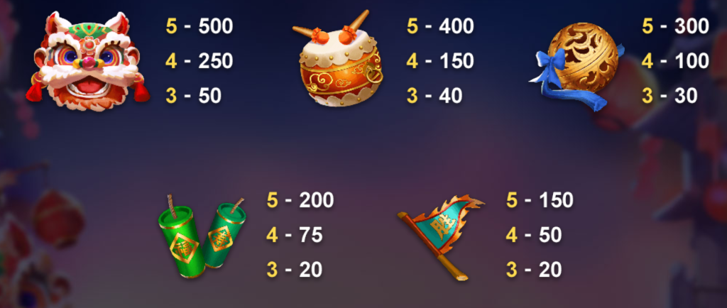 遊戲中的符號設計以中國傳統文化為主題,包括舞獅頭、鼓、鞭炮、旗幟等,每一個符號都寓意著吉祥與祝福。