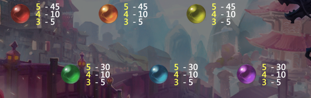 在賠付表中,低價值符號以各種顏色的珠寶呈現,包括紅、黃、綠、藍、紫五種,這些符號的獎勵介於5倍至45倍之間。轉出5個紅、黃、綠色珠寶時,可獲得45倍獎勵,而藍色和紫色珠寶則提供較低的回報。