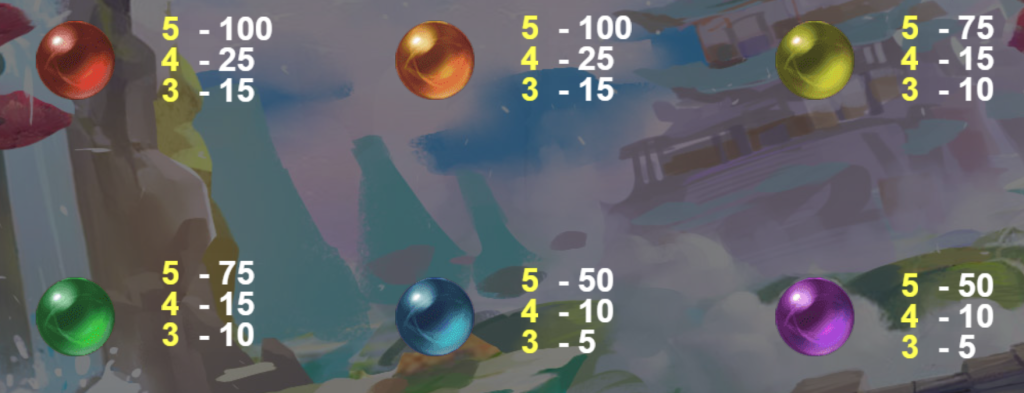 遊戲中的低價值符號由各種色彩繽紛的珠子組成,分別為紅、黃、綠、藍、紫五種。紅色與黃色珠子的最大回報為100倍,而綠色珠子為75倍,藍色與紫色則提供50倍的回報。我認為這些珠子雖然回報較低,但在遊戲中頻繁出現,能夠有效幫助玩家保持遊戲的穩定進行,延長遊玩時間。