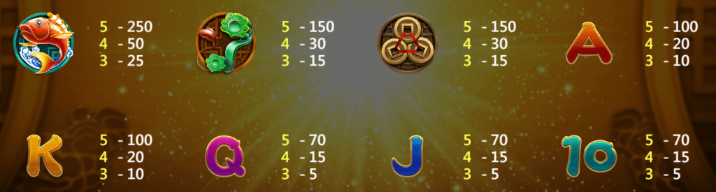 在《富貴年年》中,最具價值的圖標非金魚莫屬,獲得五個金魚圖示將帶來250倍的賠付,而四個和三個分別可獲得50倍與25倍,象徵著年年有餘的好運。此外,如意與金錢圖標也擁有不俗的賠付,五個相同圖示可贏得150倍,代表好運與財富雙雙到來,四個與三個圖示分別可獲得30倍與15倍。