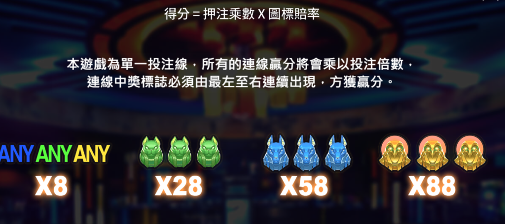 綠色貓神圖標的賠付也相當可觀,連續出現3個即可帶來28倍的獎勵,我認為這是一個相對穩定的回報,適合在長期遊戲中累積財富。最後,任何三種神獸圖標組合出現在轉軸上,仍然能夠獲得8倍的回報,這讓玩家在即使未能達成完美連線的情況下,仍有機會獲得獎勵。