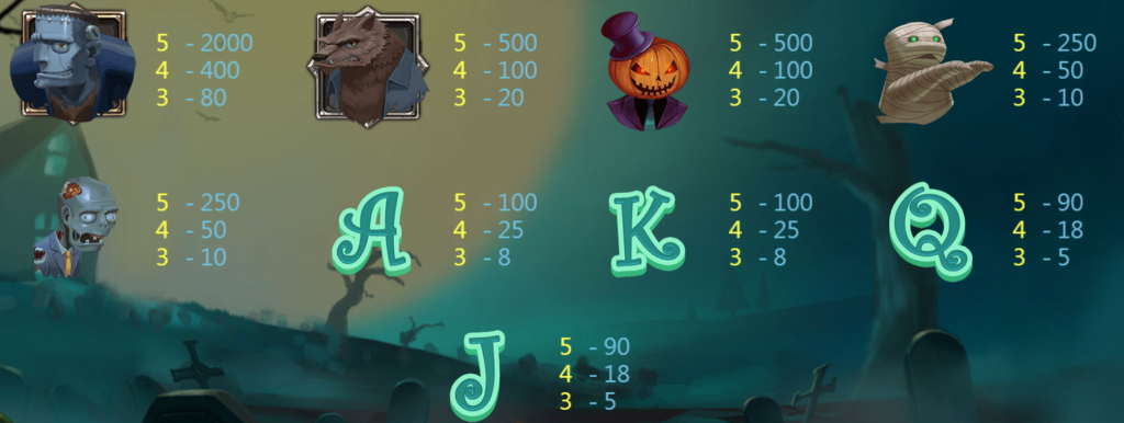 遊戲採用五軸三排的經典轉軸設計,玩家將在轉軸上看到狼人、南瓜頭、墓碑、殭屍以及字母符號,每種符號都有不同的獎勵價值。其中,最具價值的圖案是狼人,當玩家成功連線時,將可獲得豐厚的獎金。除此之外,神秘的南瓜頭圖案可能觸發免費旋轉(FREE SPINS)模式,帶來額外的中獎機會,並有可能進一步觸發超高賠付的驚喜。