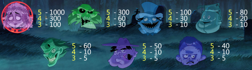 藍帽邪鬼這位詭異的幽靈紳士以5個圖案賠付100倍,4個30倍,3個10倍。它是高價區的一部分,雖然不像詛咒新娘那樣驚人,但仍然是一個極具吸引力的符號!