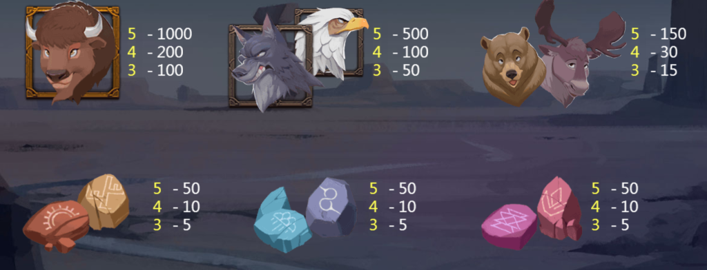 遊戲採用五軸轉輪設計,符號包含了象徵原住民信仰的圖騰石、代表力量的野熊、象徵智慧的麋鹿,以及象徵好運的捕夢網,每一個符號都與荒野生存密不可分。