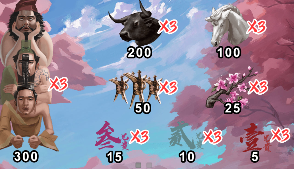 在賠付設計方面,遊戲圍繞著「三倍」這一核心概念展開,無論是人物角色、動物象徵,甚至是三國戰場中的武器裝備,均附帶三倍賠付的機制,使得整體的獲勝機率與獎勵變得更為豐厚。尤其是三兄弟的堆疊圖案,象徵著義結金蘭的堅定盟約,並且擁有最高的獎勵價值,讓玩家能夠感受到結義之後帶來的強大戰力。此外,戰馬、牛、弓箭等象徵三國戰爭元素的符號同樣具有高額賠付,讓玩家在轉動捲軸的同時,也能體驗到身臨其境的三國亂世。