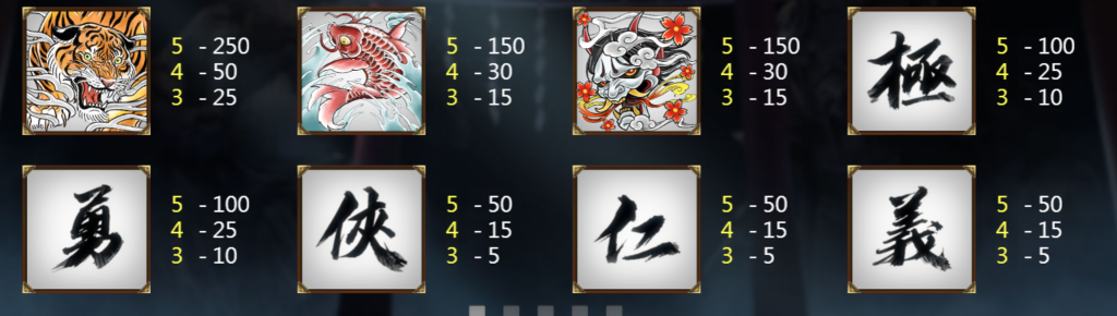 遊戲中的書法字體,如「極」、「義」、「勇」、「俠」等,則象徵著極道文化中的信仰與價值,這些標誌雖然賠付較低,卻能夠頻繁出現,讓玩家在遊戲過程中不斷累積勝利。我認為這樣的設計,是對極道文化的一種致敬,讓玩家在遊戲的過程中,彷彿感受到黑幫兄弟之間的忠誠與信任。