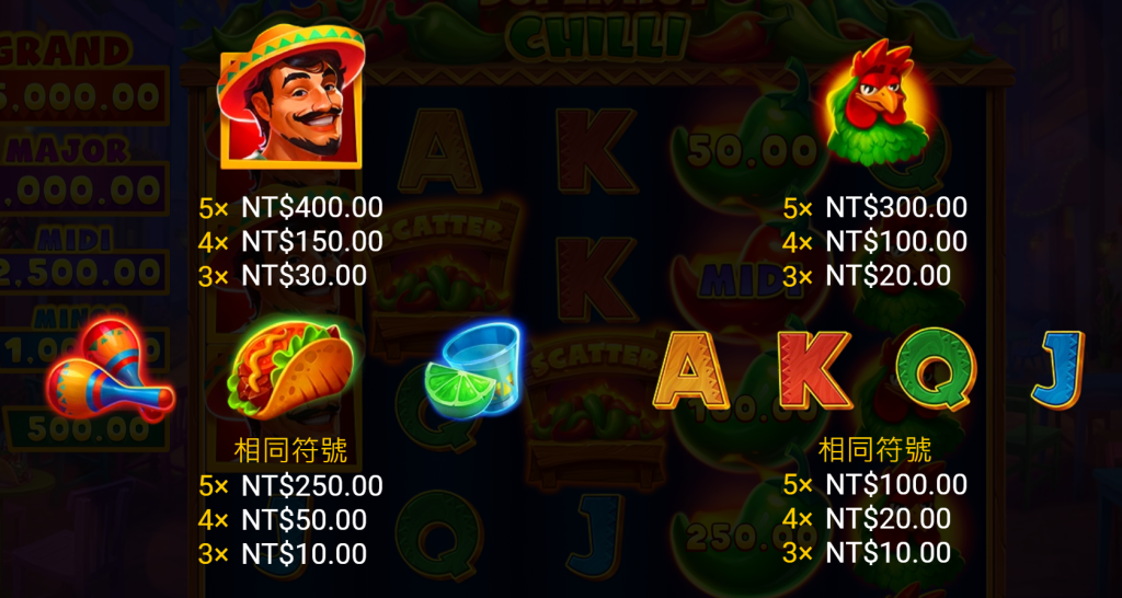 遊戲中還包含了許多標誌性的墨西哥元素,例如墨西哥塔可與馬拉卡斯,這些符號不僅代表著墨西哥的街頭美食與音樂文化,同時也能帶來相當可觀的獎勵,五個連線可贏得$250,讓玩家在享受熱鬧場景的同時,也能收穫豐厚的彩金。此外,字母符號A、K、Q、J則代表著較為基本的獎勵,雖然賠付較低,但在遊戲中頻繁出現,能夠提供穩定的收益。