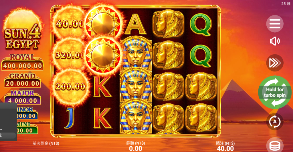 遊戲以經典的5×3轉輪設計,搭配耀眼的太陽金幣與神秘法老符號,為玩家帶來極具視覺衝擊的沉浸式體驗。最具特色的就是太陽金幣重轉機制,當轉輪上出現6個以上的火焰金幣,即可觸發Bonus Game,並有機會贏取Mini、Minor、Major、Grand,甚至是最高級的Royal Jackpot,獎勵高達400,000.00!