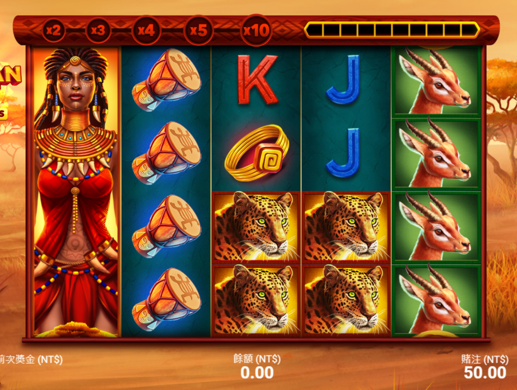 遊戲採用標準5×3轉軸設計,並擁有多種獎勵機制。圖案包含各式非洲特有的動物,如獵豹、羚羊等,象徵著強大與自由的精神,而身穿華麗飾品的部落女王則是遊戲的亮點之一,可能帶來高額獎勵。我認為,這款遊戲最吸引人的地方就是它的倍數獎勵系統,當畫面上累積一定的特殊圖案時,獎勵倍數將從2倍、3倍一路提升至10倍,這讓每一次旋轉都充滿期待與爆發力。