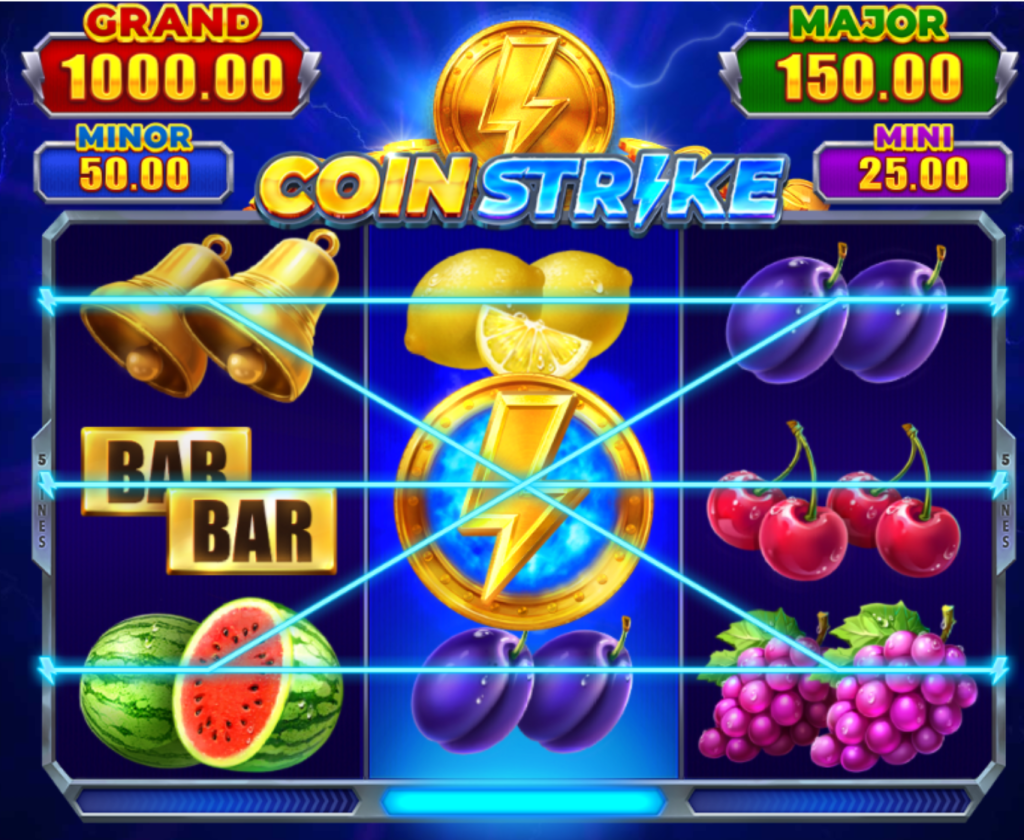 遊戲核心亮點來自於雷霆金幣符號,當這些帶電的金幣落下時,可能觸發Coin Strike獎勵機制,開啟額外彩金機會,甚至直擊GRAND JACKPOT 1000倍獎金!此外,遊戲採用3×3轉軸設計,搭配5條固定獲勝線,玩法簡單但獎勵豐厚,無論是新手還是資深玩家,都能感受到快速旋轉帶來的刺激感。