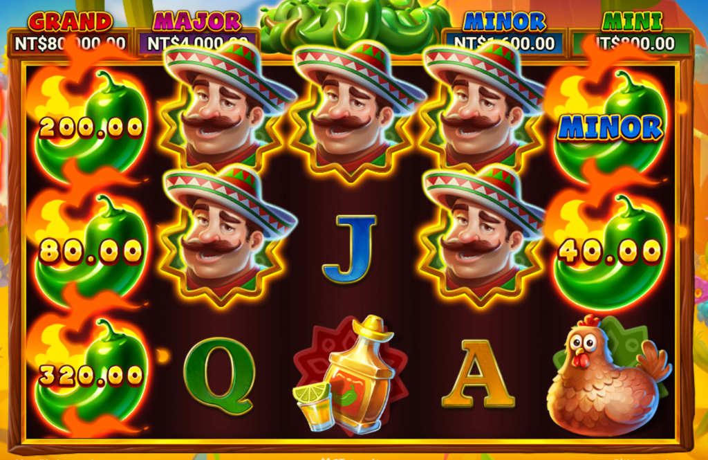 轉軸設計極具動感,火辣辣的綠色辣椒不僅是遊戲的核心象徵,更是玩家通往高額獎勵的關鍵符號。遊戲內設有「MINI、MINOR、MAJOR、GRAND」四大彩金,最高獎金可達80,000!
