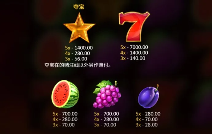 經典水果圖案的賠付則相對穩定,西瓜與葡萄同為高價值水果符號,五個連線可獲得700倍的獎金,這對於想要穩健累積獎勵的玩家來說是一個不錯的選擇。藍色李子雖然賠付較低,但仍然能帶來穩定的回報,適合那些喜歡穩定中尋求突破的玩家。我覺得這款遊戲在賠付設計上做到了經典與現代的完美融合,既能滿足老玩家的懷舊需求,也能讓新玩家快速上手並享受旋轉的樂趣。
