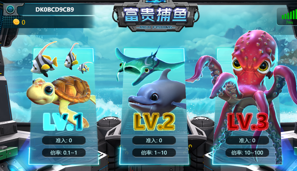 遊戲分為LV.1、LV.2與LV.3三個房間,分別對應不同的倍數獎勵與挑戰難度。初階玩家可以選擇LV.1,倍數範圍在0.1到1之間,適合輕鬆享受捕魚樂趣。而LV.2則是中級玩家的最佳選擇,倍數提升至1到10,讓獎勵更具挑戰性。