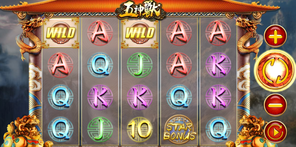 遊戲畫面兩側的祥龍與貔貅象徵財運與守護,加上鮮明的轉輪、押注操作介面,不僅讓遊戲更有文化氣息,也提升操作的沉浸感。《五神獸》結合視覺震撼與神話魅力,是一場跨越凡間與仙界的精彩挑戰。